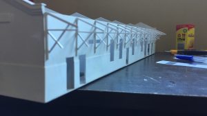 Para adornar as fachadas, usei camadas de estireno 0,30mm e 0,50mm sobrepostas. Isso deu efeito desejado de acabamento na borda da fachada, rente ao telhado.